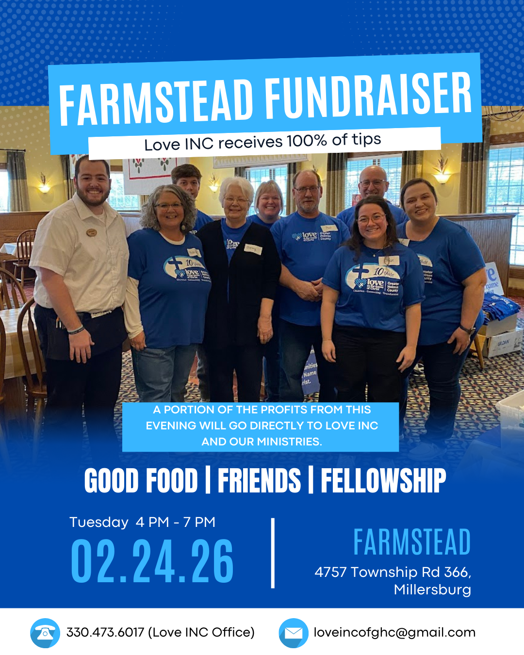 Mark your calendars for Tuesday, February 24th from 4:00–7:00 PM and join us for our Annual Farmstead Fundraiser! Enjoy an evening of good food, great friends, and warm fellowship as you dine in at the Farmstead Restaurant. A portion of the profits from this special evening will go directly to Love INC and our local […]