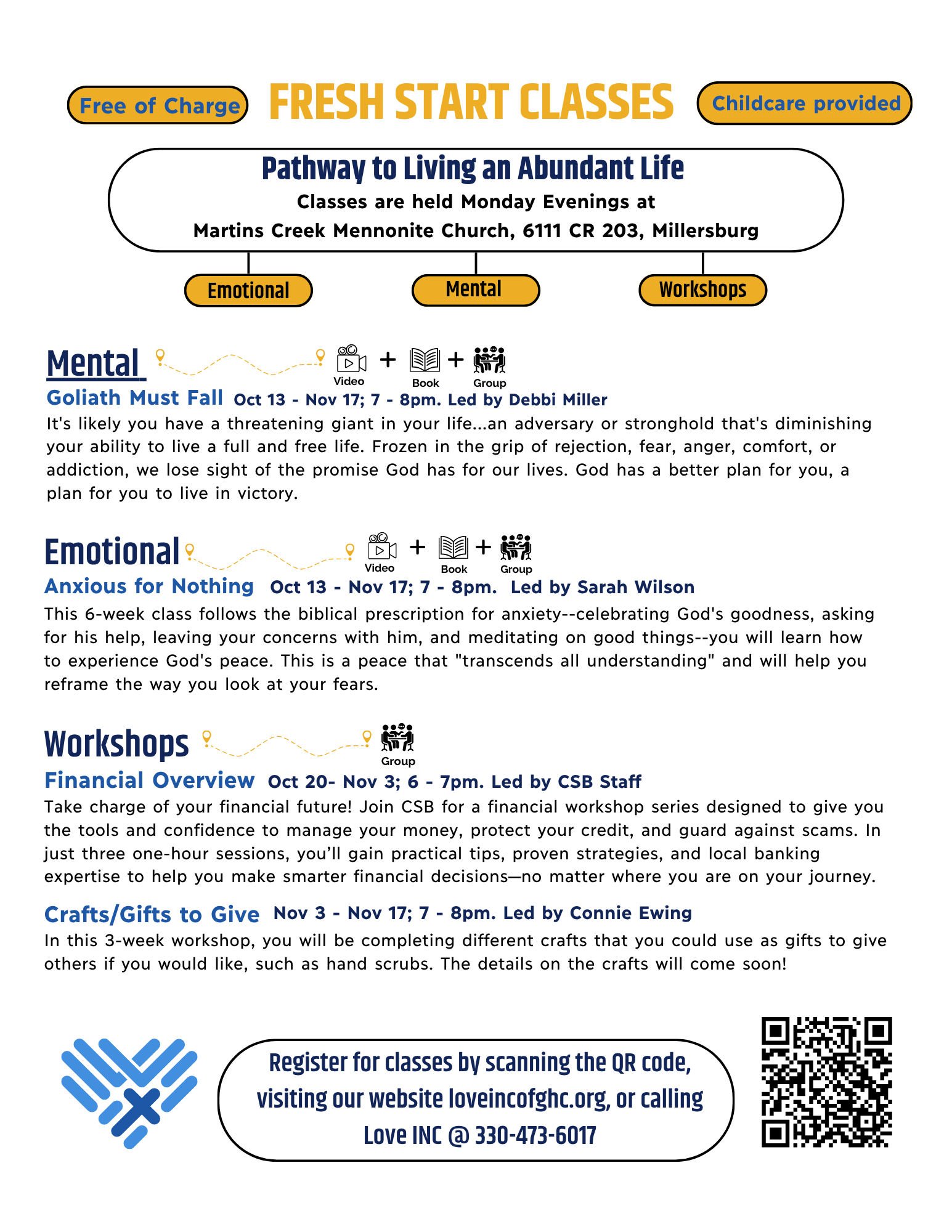 We are so excited to see you at one of our upcoming classes! Read the descriptions for our upcoming classes below and sign up for these classes using the form at the bottom of the page or give us a call at 330.473.6017. These classes will all meet on Monday evenings at Martins Creek Mennonite Church 6111 CR 203, Millersburg.